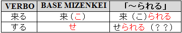 Com relação aos verbos irregulares 「来る」 e 「する」 , como as bases Mizenkei são 「こ」 e 「せ」 respectivamente, devemos anexar 「られる」 :