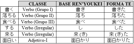 Feita essa observação importante, comecemos abordando a partícula 「て」 que é muito importante, sendo uma das terminações mais usadas na língua japonesa. É tão importante que é chamada de “Forma TE”. Veja a regra para obtê-la: